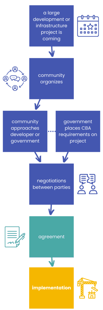 When a large development or infrastructure project is coming to a neighbourhood, it may be identified by a Community Benefits organization as a good candidate for a CBA, for instance because of its potential to disrupt residents’ lives or concern that they would not otherwise benefit economically from the development. At this point, the community needs to organize to be in a position to ask for a CBA. This type of agreement requires grassroots action and significant community involvement.